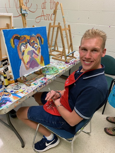 Blake was diagnosed with autism at the age of three. Art therapy not only helped him to express his thoughts but also his own perspective of the world. His formal training began at the Arc of High Point and he continues to take lessons here. With over fifteen years of experience, Blake loves to paint animals the most and is famous for the imaginative expressions he gives the animals. He also has a special connection with St. John (U.S. Virgin Islands) which began with him painting images of the island from photos his mother had taken and from his trips to the island. Since then Blake has made multiple donations from the sale of his St. John inspired art to help rebuild schools after hurricanes devastated the small island. Proceeds from his art also benefit The Arc of High Point’s creative arts program. Blake’s art is also sold through retailers like Lowes, Bed, Bath and Beyond, Home Depot and others. His mom Leann, who herself is an artist, is actively helping Blake to explore his creativity.